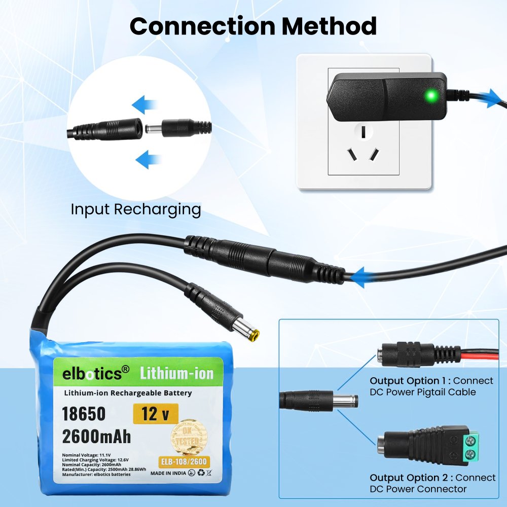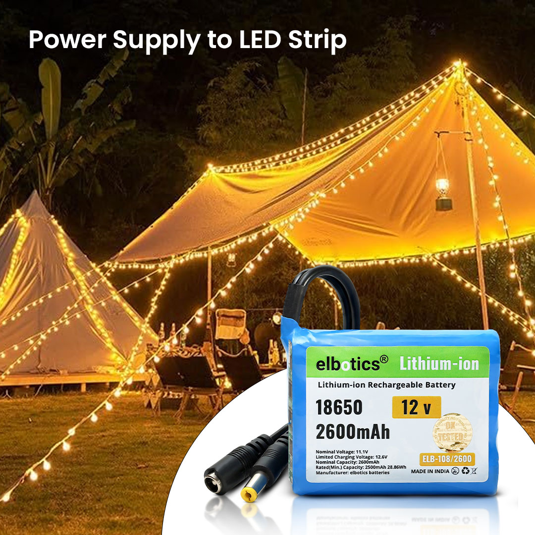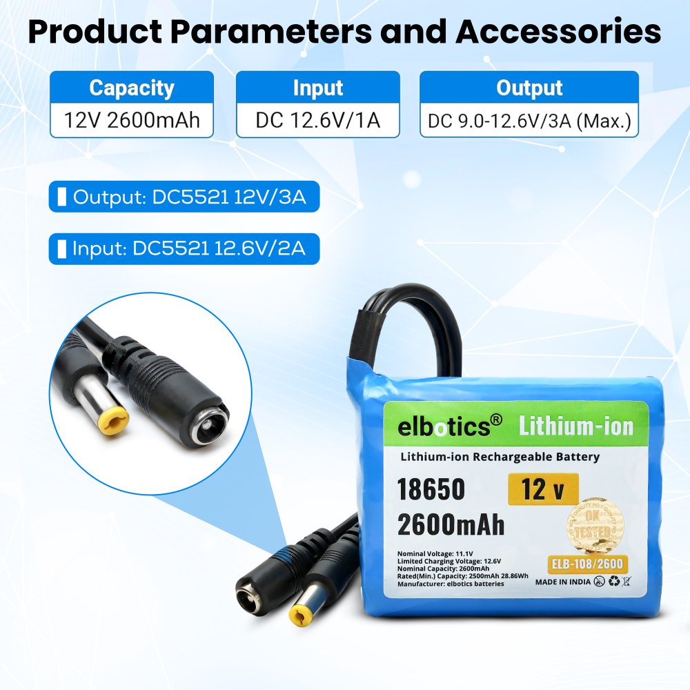 Power up your devices with the reliable and high-performance ELBOTICS 12V 2600mAh Li-ion Rechargeable Battery Pack. Designed with advanced 3S 18650 Lithium-ion cells, this battery pack offers a stable voltage range of 11.1V to 12.6V, making it an ideal power source for a wide range of electronic applications. Whether you're building a DIY project or need a dependable battery for everyday gadgets, this compact and efficient battery is the perfect solution. It’s compatible with solar panels, CCTV cameras, camcorders, IoT devices, Bluetooth speakers, aeroplane toys, LED strip lights, robotics kits, industrial equipment, and more. Built with safety and durability, the ELBOTICS battery pack protects against overcharging, overheating, and short-circuits, ensuring long life and consistent performance. In addition, its lightweight and compact design makes it easy to install in tight spaces without compromising on power. This battery delivers reliable energy for indoor and outdoor applications, perfect for innovators, hobbyists, and professionals alike. Choose ELBOTICS for smarter, safer, and longer-lasting power solutions.