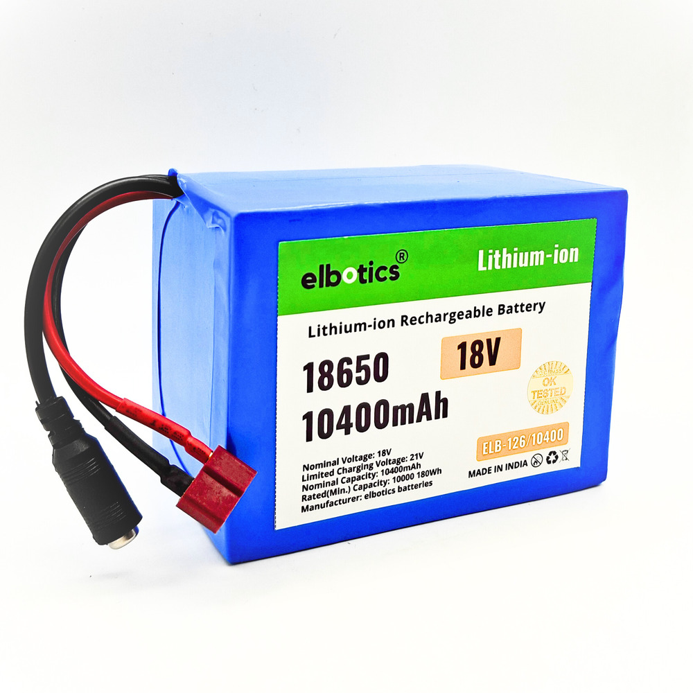 Power up your projects with the Elbotics 18V 10400mAh Lithium-ion Rechargeable Battery Pack, built for high performance and reliability. This compact, long-lasting power solution uses premium 18650 Li-ion cells and is equipped with an advanced Battery Management System (BMS) to ensure protection against overcharging, over-discharging, overheating, and short-circuiting. Ideal for a wide range of applications such as robotics, DIY electronics, power tools, e-bikes, electric scooters, solar lights, and more.