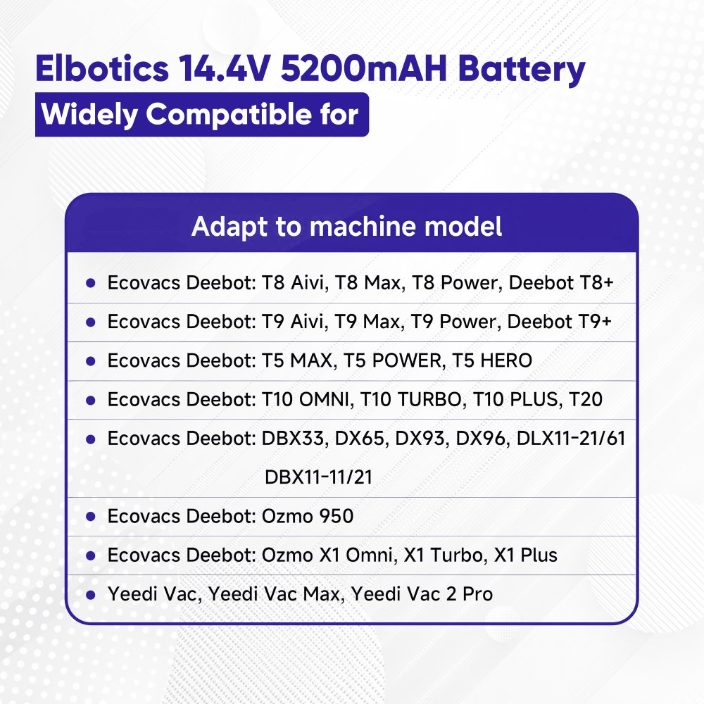Upgrade your ECOVACS Deebot with the reliable and high-performance ELBOTICS® Replacement Battery. Designed for wide compatibility and built with safety and durability in mind, this battery is the perfect solution to keep your robot vacuum running at peak efficiency.